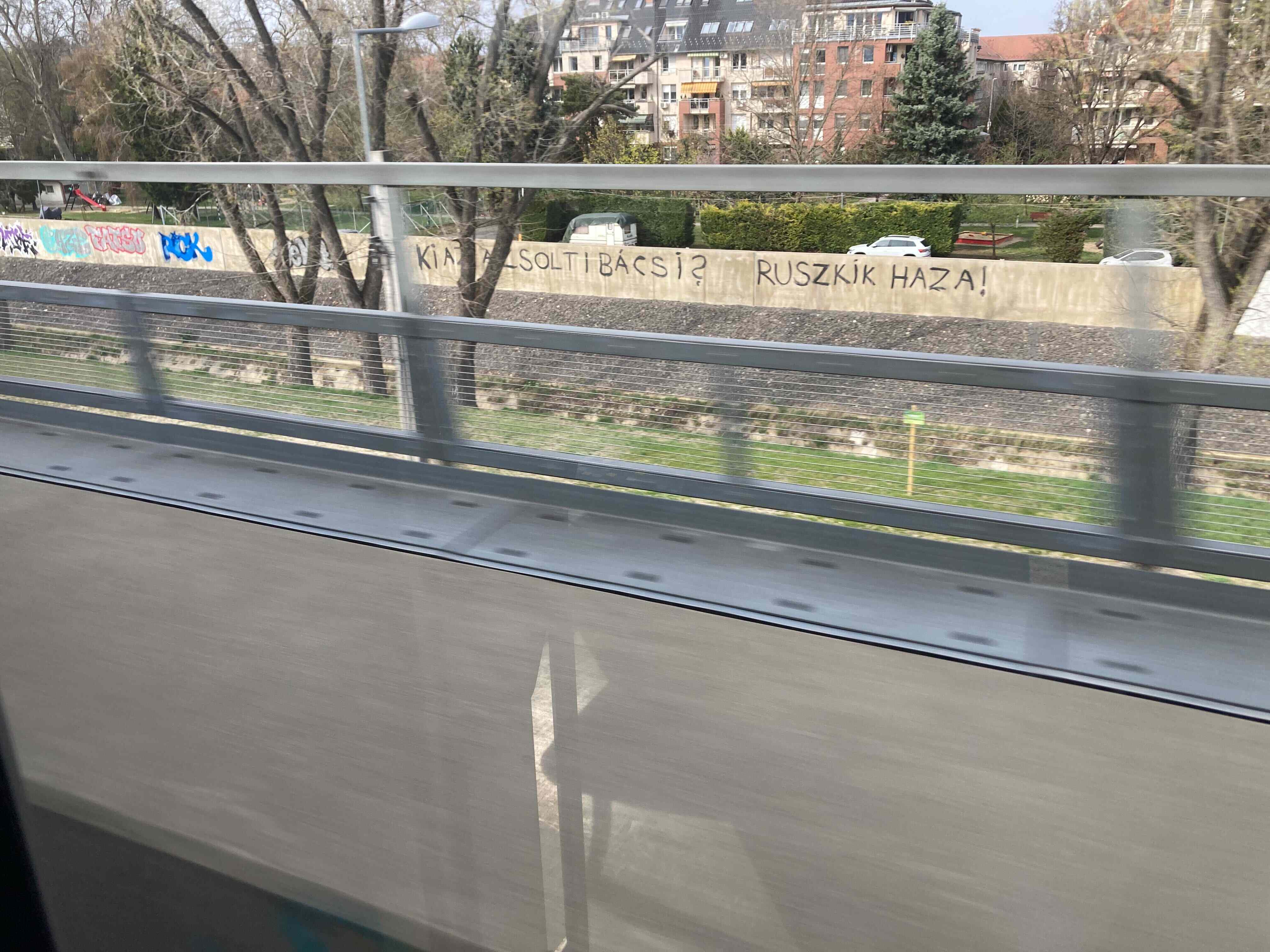 A vonaton utazva egy szakaszon jól látható az 1956-os forradalmat idéző Ruszkik haza!, valamint a Ki az a Zsolti bácsi? felirat.